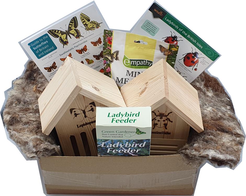 This Butterfly Shelter and Feeder Giftbox contains all you need to keep butterflies happy in your garden and makes a unique and interesting gift. Delivered in a plain box ready for wrapping, this giftbox contains a Butterfly Shelter PLUS a Ladybird Shelter, a TWIN pack ofLadybird Feeders, a Butterfly AND Ladybird Field Guide and a Butterfly Wildflower Seed Mixture wrapped in a Wool Planting Roll (that can be re-used). Contents normally £65.94, Price £48.99 saving £16.95.