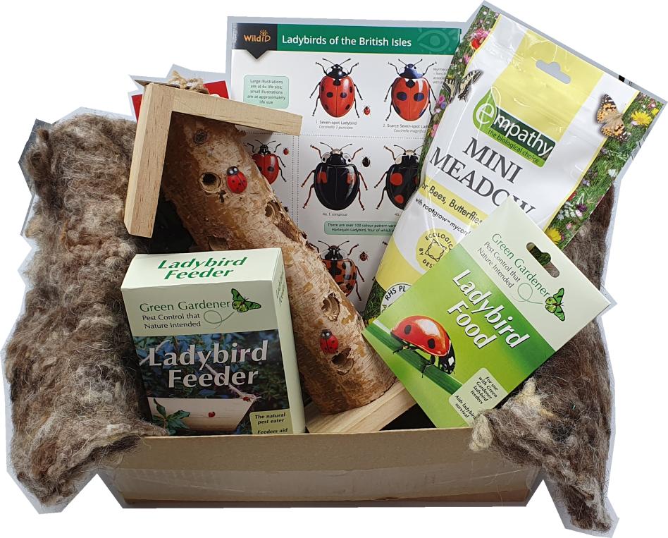 This Deluxe Ladybird Giftbox contains all you need to keep ladybirds happy in your garden and makes a unique and interesting gift. Delivered in a plain box ready for wrapping, this giftbox contains a Ladybird House PLUS Ladybird Food, a twin pack of Ladybird Feeders, Butterfly, Bee and Bug Wildflower Seed Mixture 3 sqm and a Ladybird Field Guide wrapped in a Wool Planting Roll (that can be re-used). Contents normally £53.75, Price £38.99 saving £14.76. The contents include :-