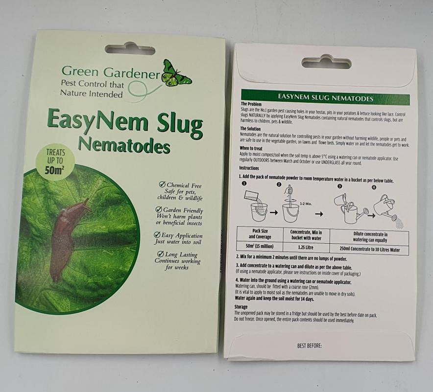 Each pack of Green Gardener EasyNem Slug Nematodes contains 15 million microscopic beneficial nematodes (Phasmarhabditis Californica) in a NEW easy mix formulae. They are invisible to the naked eye and come as a powder, which is mixed with water and applied to the soil where they search out and invade the slugs. As the nematodes invade the slug, it will stop feeding, so your plants are safe and will burrow underground to die. As it decomposes in the soil, the nematodes are released back into the soil to search out more slugs and the whole process starts again. They work at temperatures above 5c/40f, so apply UNDERGLASS all year round OR apply OUTDOORS during the growing season i.e. between March and November. Each application of EasySlug Nematodes will control slugs for six weeks, so for a slug free garden, apply it every 6 weeks. Being a living, perishable product (it will keep for 2 weeks in the fridge), order it when you are ready to apply or select your dispatch date below.